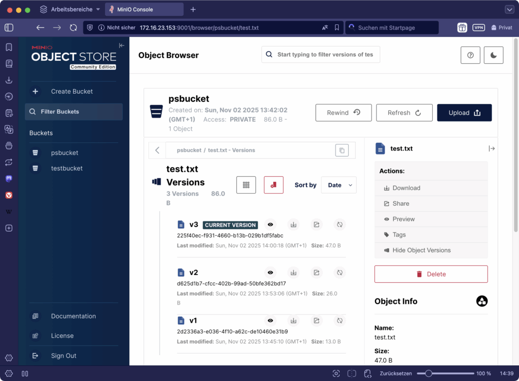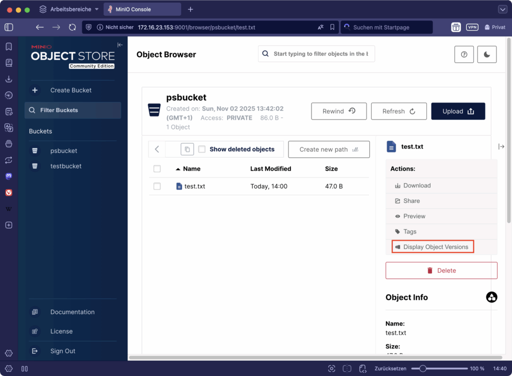 Das Object Storage zeigt nun zwei Versionen dieses Objekts an: